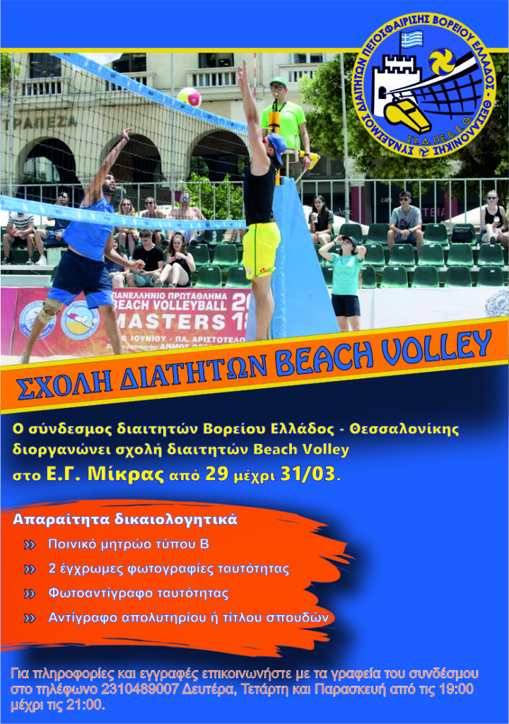 Ο ΣΥ. Δ. ΠΕ. Β. Ε. Θ. σε συνεργασία με την Ο. Δ. Β. Ε., διοργανώνει σχολή διαιτητών Beach Volley το τριήμερο 29 μέχρι 31 Μαρτίου στο Ε. Γ. Μίκρας. Οι ενδιαφερόμενοι θα πρέπει να επικοινωνήσουν με τα γραφεία του συνδέσμου για περισσότερες πληροφορίες τις ημέρες και ώρες λειτουργίας του.