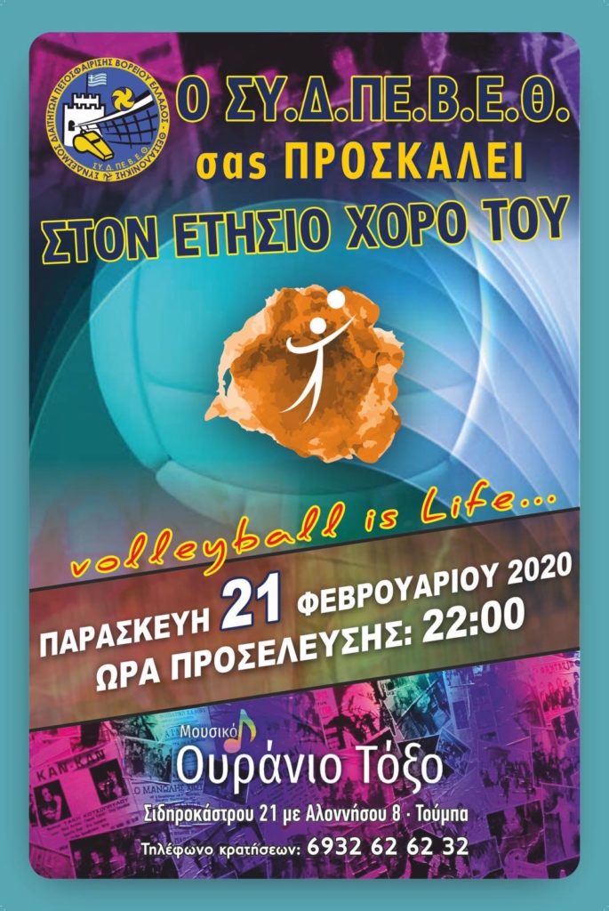 Ο Συ. Δ. Πε. Β. Ε. Θ. σας προσκαλεί στον ετήσιο χορό του, που μετά τις επιτυχημένες διοργανώσεις στα Λαδάδικα και την αίθουσα δεξιώσεων “Λευκή”, αποφασίσαμε να μεταφέρουμε στο “Μουσικό Ουράνιο Τόξο”. Ένα μαγαζί με ζωντανή μουσική που βρίσκεται στην περιοχή της Τούμπας. Τα μέλη μας και οι φίλοι του βόλεϊ που επιθυμούν να παρευρεθούν, μπορούν να προμηθευτούν προσκλήσεις από τα μέλη του Δ.Σ και να κρατήσουν τραπέζι για την καλύτερη εξυπηρέτησή τους.